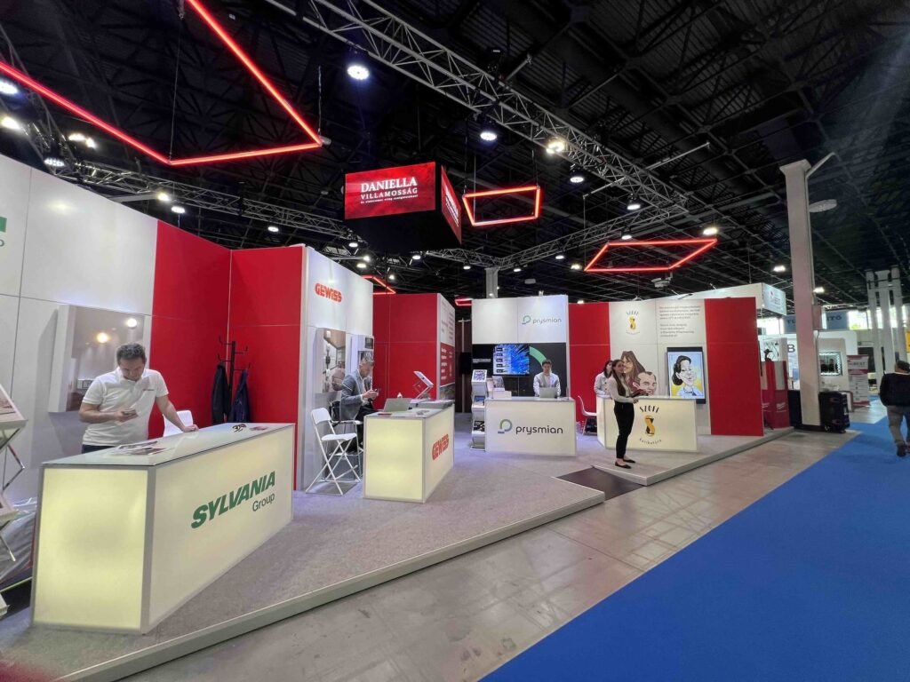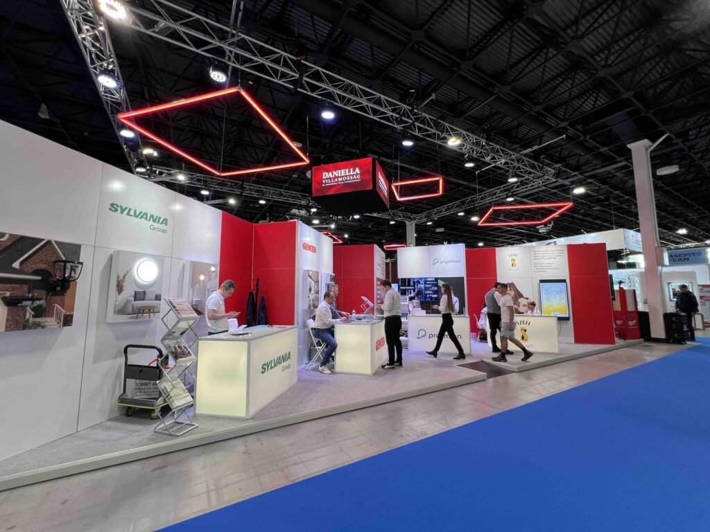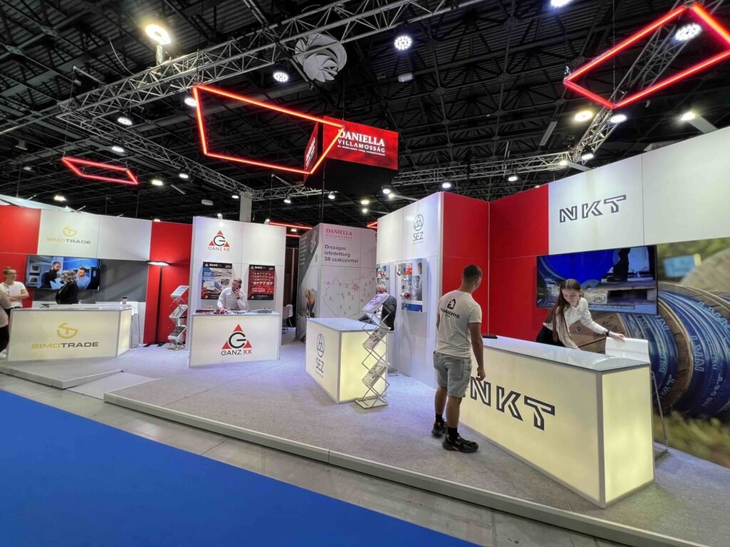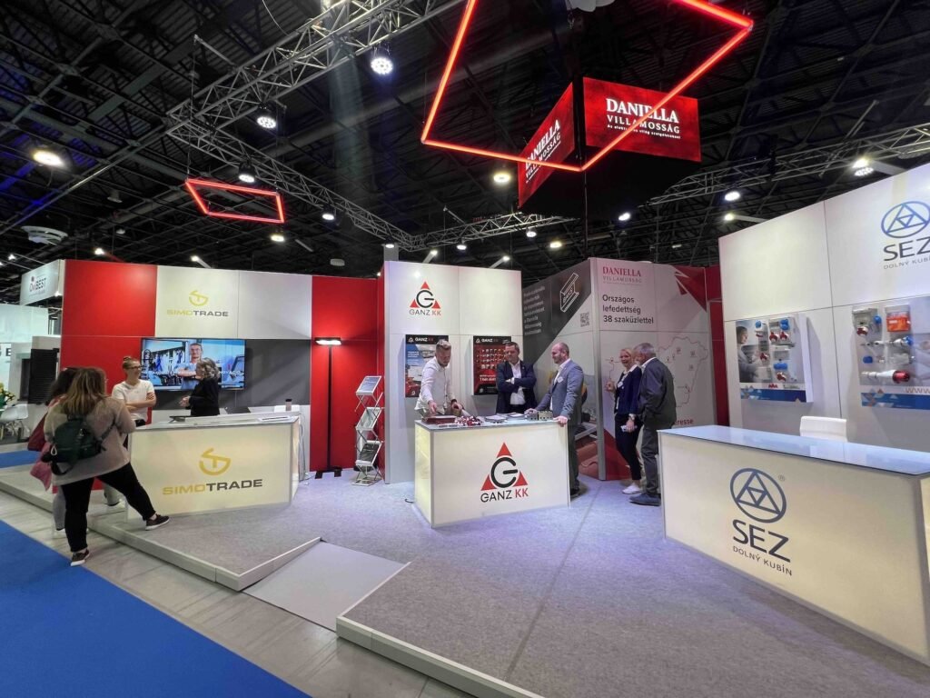 2024-ben a CONSTRUMA Kiállításon moduláris raktárkészletről elérhető elemekből terveztük és építettük fel a Daniella 160 m2-es standját a Szénási Event megbízásából.