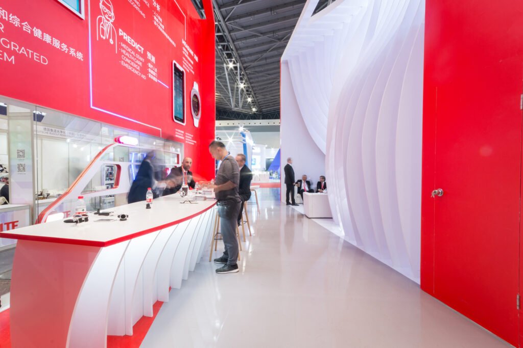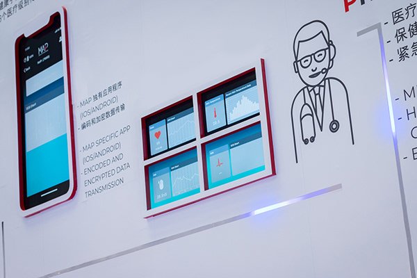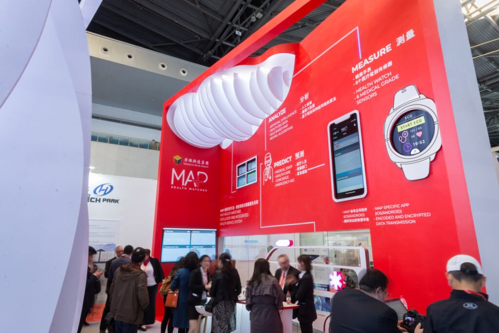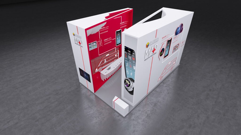 2019-ben a magyar tech startup, a MAP Healthwatch saját standdal lépett fel a Kínai Nemzetközi Technológiai Vásáron. A koncepciónkat a felhőben történő információáramlás vizualizációjára alapoztuk meg. Mi terveztük meg az installáció elemeit, a grafikai arculatot és a stand témájához kapcsolódó animációkat. A fő cél az volt, hogy bemutassuk az információ folyamatos áramlását a Healthwatch, a telefon, az adatelemző felhő és a teljes körű egészségügyi ellátást és sürgősségi szolgáltatást nyújtó diszpécserközpont között.