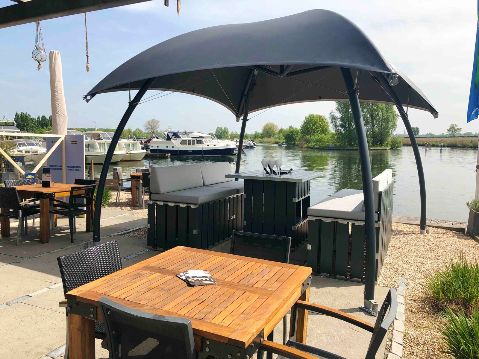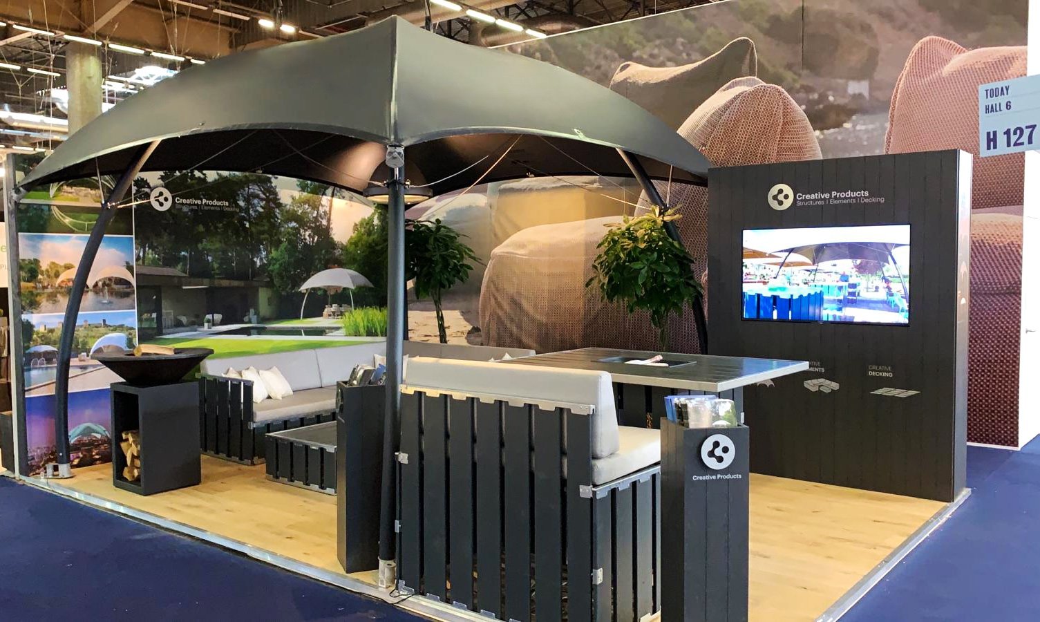 Ívelt elemivel kecses fedési lehetőséget nyújt kültéri standok vagy pultok kiegészítőjeként. Kültérre ajánljuk.